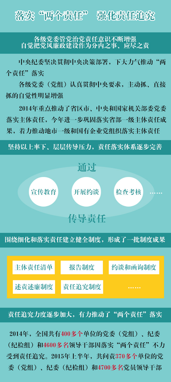 2014年,全国共有400多个单位的党委(党组)、纪委(纪检组)和4600多名领导干部因落实“两个责任”不力受到责任追究。2015年上半年,共问责370多个单位的党委(党组)、纪委(纪检组)和4700多名党员领导干部。2015年上半年责任追究总人数与2014年全年责任追究总人数大体持平。正在逐步加大的责任追究力度,倒逼“两个责任”落到实处。(中央纪委监察部网站 吴晶 郭兴)