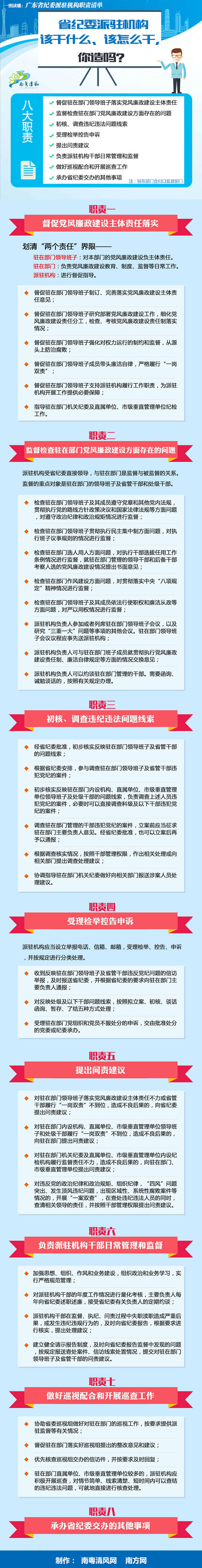 为贯彻落实《关于加强省纪委派驻机构建设的意见》(粤办发〔2015〕20号文),使派驻机构更加明确自己该干什么、该怎么干,近日,省纪委出台了《派驻机构职责清单》(以下简称《职责清单》),以拉清单的方式列举了派驻机构8个方面35项工作职责。