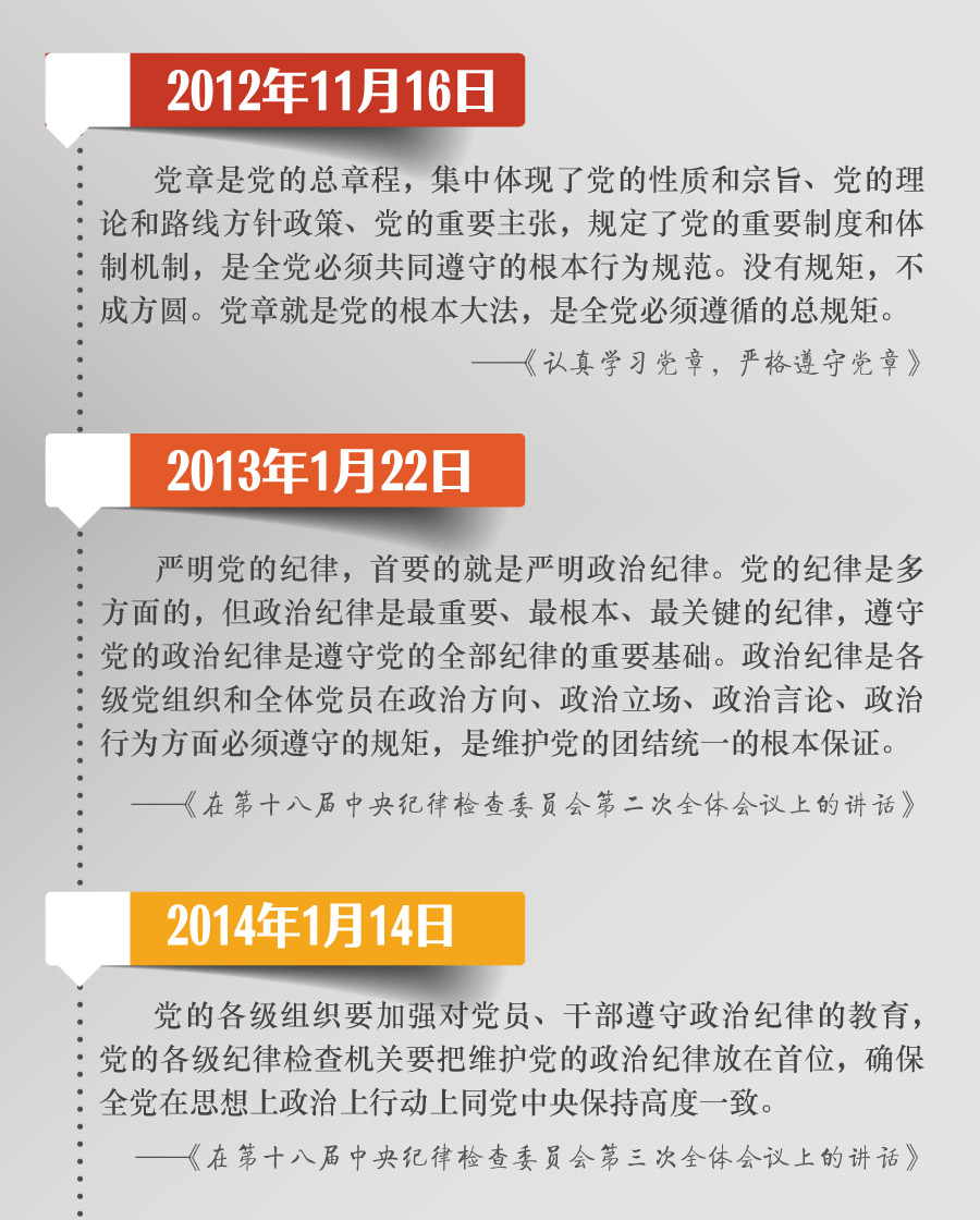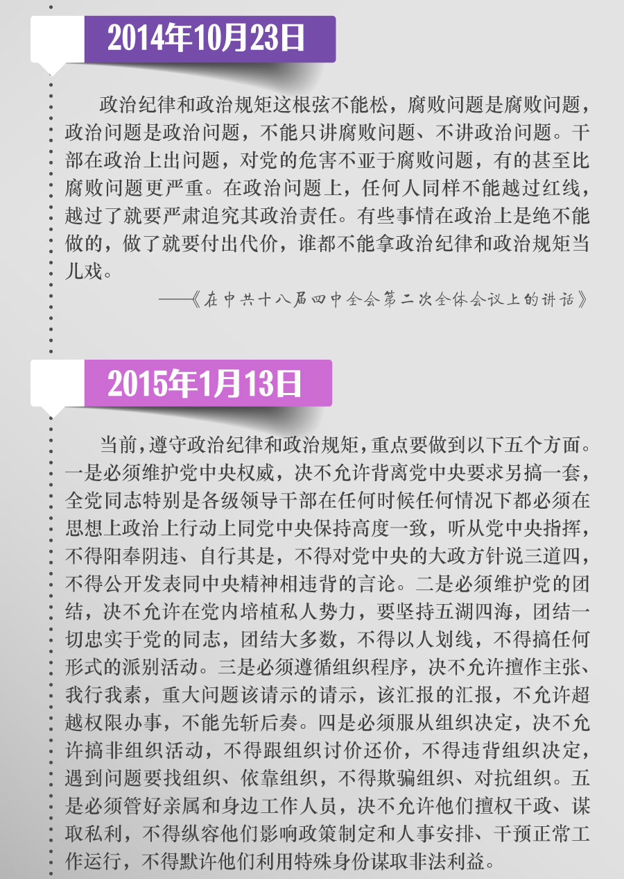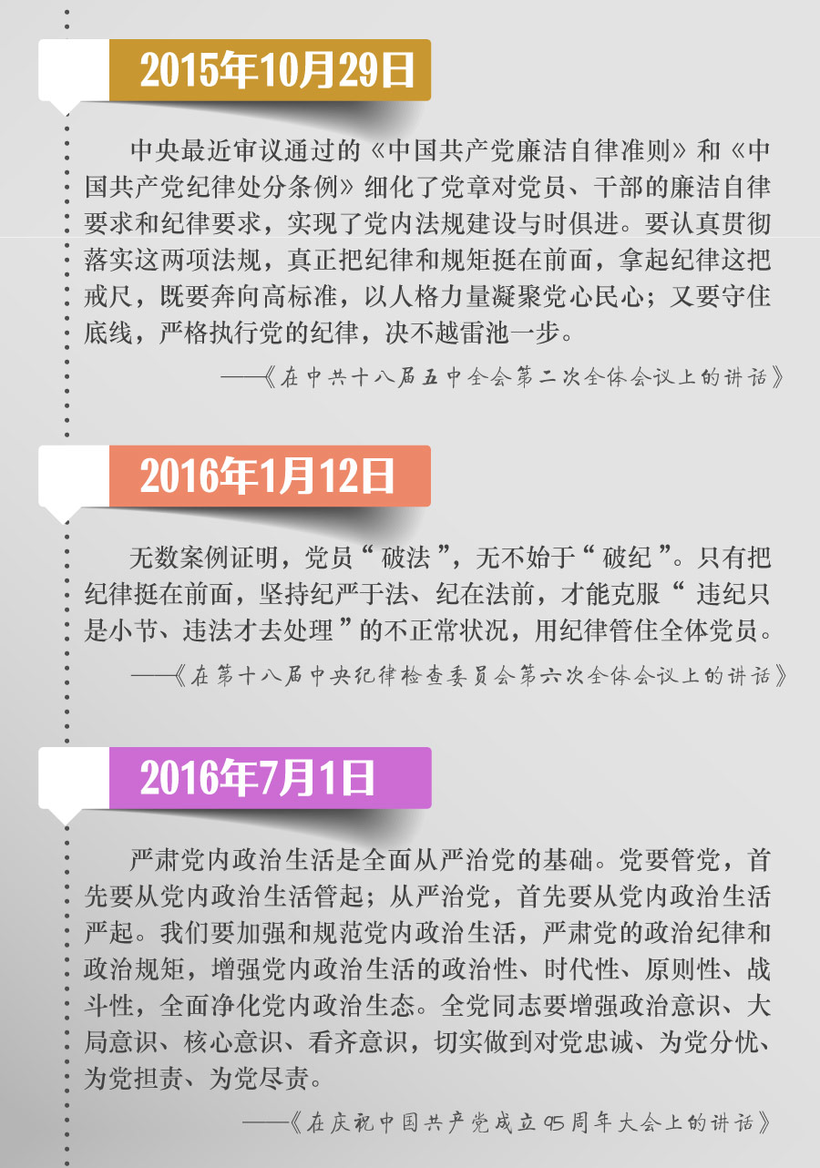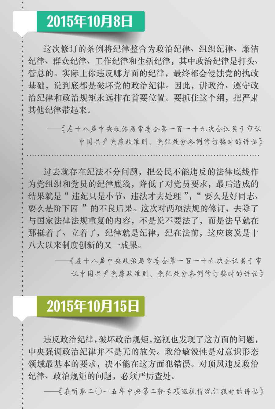 2016年10月,十八届六中全会审议通过的《关于新形势下党内政治生活的若干准则》将“严明党的政治纪律”专列为一部分,强调了12个“不准”,《中国共产党党内监督条例》把“严明党的纪律特别是政治纪律和政治规矩”作为党内监督的重要内容。
