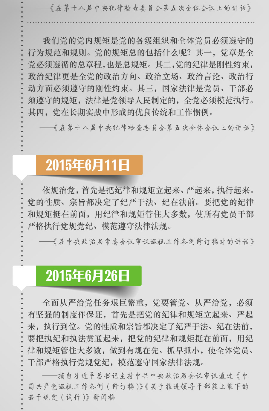依规治党,首先是把纪律和规矩立起来、严起来、执行起来。五年来,党的纪律规定根据形势和党的建设需要不断完善——