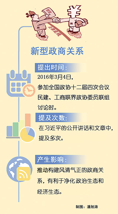 习近平指出,新型政商关系,概括起来说就是“亲”、“清”两个字。对领导干部而言,所谓“亲”,就是要坦荡真诚同民营企业接触交往,特别是在民营企业遇到困难和问题情况下更要积极作为、靠前服务,对非公有制经济人士多关注、多谈心、多引导,帮助解决实际困难,真心实意支持民营经济发展。所谓“清”,就是同民营企业家的关系要清白、纯洁,不能有贪心私心,不能以权谋私,不能搞权钱交易。对民营企业家而言,所谓“亲”,就是积极主动同各级党委和政府及部门多沟通多交流,讲真话,说实情,建诤言,满腔热情支持地方发展。所谓“清”,就是要洁身自好、走正道,做到遵纪守法办企业、光明正大搞经营。