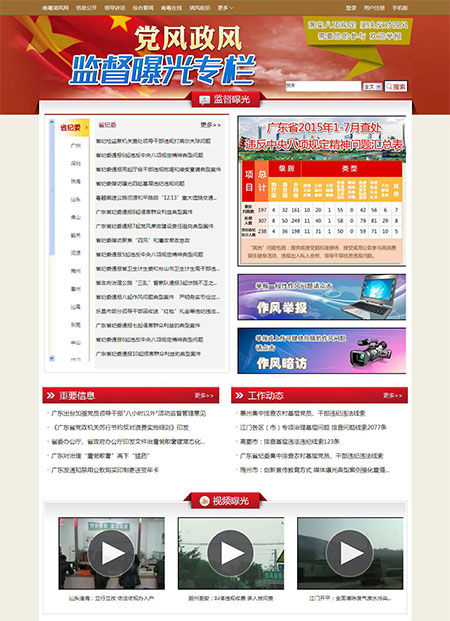 8月10日,广东省纪委整合广东省作风举报网等平台,在官方网站南粤清风网(http://www.gdjct.gd.gov.cn)首页正式开通党风政风监督曝光专栏,为广大群众提供一个监督“四风”问题和了解作风建设的窗口,向社会释放正风肃纪的强烈信号。