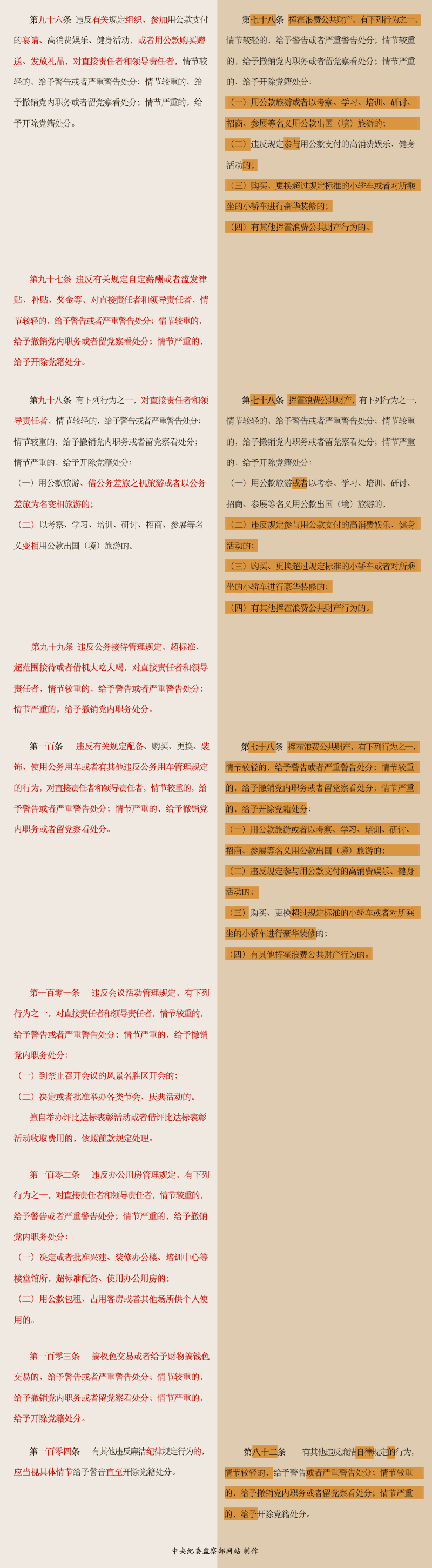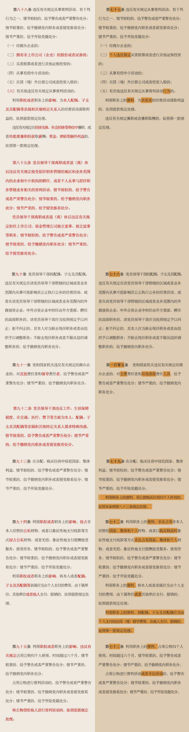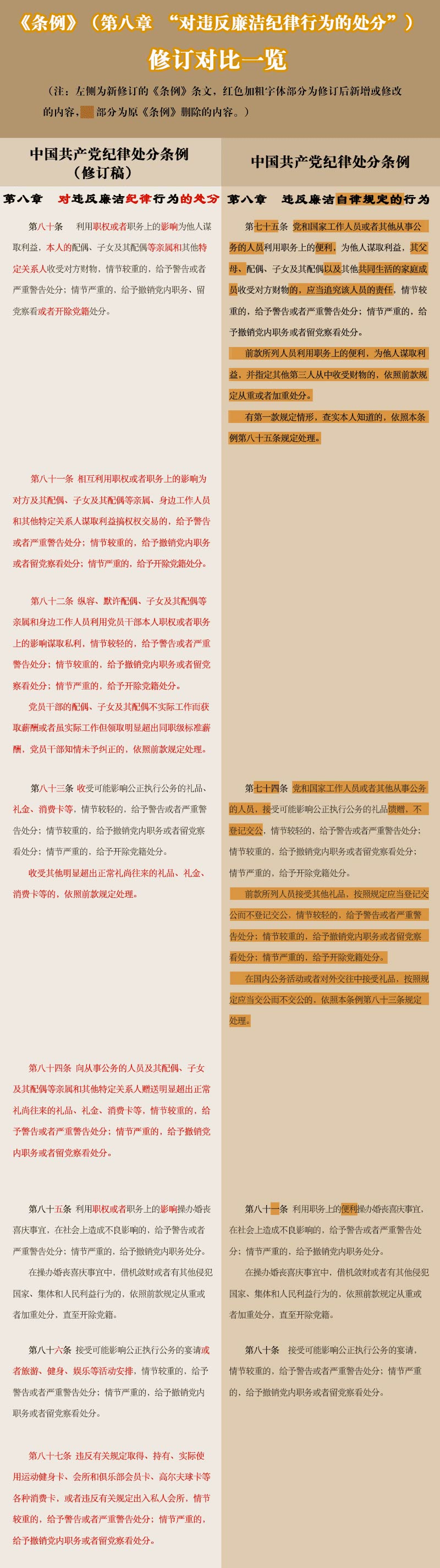 《条例》第八章“对违反廉洁纪律行为的处分”,主要对党员干部特别是领导干部以权谋私的违纪行为作出处分规定。将原《廉政准则》规定的“8个禁止”“52个不准”相关内容纳入条例。增加了权权交易,对亲属和身边工作人员失管,赠送明显超出正常礼尚往来的礼品、礼金、消费卡,违规取得、持有和实际使用运动健身卡、高尔夫球卡等各种消费卡,违规出入私人会所,离职或退(离)休后违规从事营利活动,违规自定薪酬或者滥发津贴、补贴、奖金等,违反规定超标准、超范围接待或者借机大吃大喝,搞权色交易和钱色交易等违纪条款,充分体现出全面从严治党的要求。