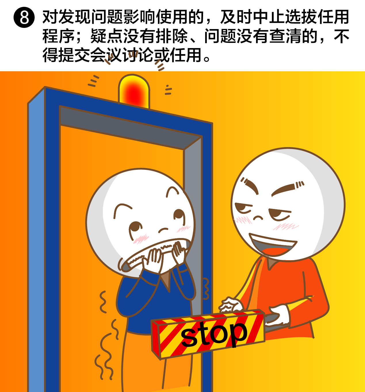强化任前把关。考察工作要突出针对性、增强灵活性、提高有效性,针对不同考察对象的具体情况,细化考察内容,改进考察方式,力争考察结果全面、客观、准确。选好配强考察工作人员,明确考察谈话保密与承诺责任,营造讲真话的氛围,提高考察质量。根据考察对象履历、家庭关系、社会背景等情况,抓住重要行为特征,有针对性地找知情人谈话。适当拉开考察与会议讨论的时间间隔,采取民意调查、专项调查、延伸考察、实地走访、家访等办法,广泛深入地了解干部。改进考察对象公示和任职前公示方式,探索扩大公示内容、范围和延长公示时间,充分接受干部群众监督。强化审核措施,做到干部档案“凡提必审”,个人有关事项报告“凡提必核”,纪检监察机关意见“凡提必听”,反映违规违纪问题线索具体、有可查性的信访举报“凡提必查”。前移审核关口,做到动议即审,该核早核。对发现问题影响使用的,及时中止选拔任用程序;疑点没有排除、问题没有查清的,不得提交会议讨论或任用。对一时存疑、暂未使用的干部,要本着高度负责的态度,及时查清问题、作出结论,为那些受到诬告、诽谤、陷害的干部澄清正名,严肃处理打击报复、诬告陷害行为。坚持事业为上、公道正派,保护作风过硬、敢作敢为、锐意进取的干部,对那些想干事、能干事、敢担当、善作为的干部要旗帜鲜明地撑腰鼓劲、大胆使用。(摘自《关于防止干部“带病提拔”的意见》)(中央纪委监察部网站 王婵 王洁)