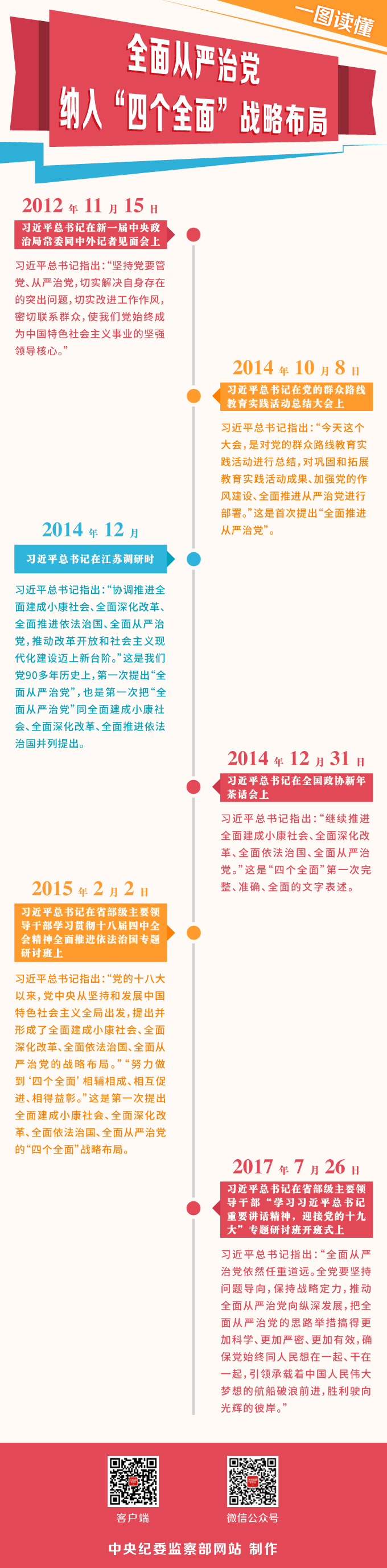 2014年12月,习近平总书记在江苏调研时强调,“协调推进全面建成小康社会、全面深化改革、全面推进依法治国、全面从严治党,推动改革开放和社会主义现代化建设迈上新台阶。”在我们党90多年历史上,第一次提出“全面从严治党”。