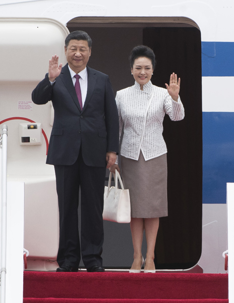 中午12时许,习近平乘坐的专机徐徐降落在香港国际机场。习近平和夫人彭丽媛走出舱门,向欢迎的人群挥手致意。香港警察乐队奏响热情喜庆的欢迎曲,现场顿时沸腾起来。在舷梯旁,两名香港少年向习近平和彭丽媛敬献鲜花。在香港特别行政区行政长官梁振英和夫人梁唐青仪陪同下,习近平和彭丽媛同前来迎接的人员亲切握手。机场上,数百名各界群众代表挥舞手中的国旗、区旗和鲜花,热烈欢迎习近平的到来。
