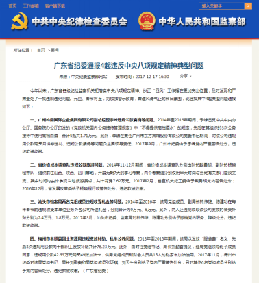 广东省纪委通报4起违反中央八项规定精神典型问题