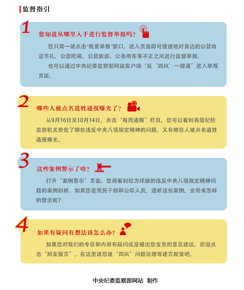中秋国庆临近,为继续紧盯重要时间节点,驰而不息纠正“四风”,严防反弹回潮,释放越往后执纪越严的强烈信号,加大社会监督力度,畅通举报渠道,净化节日风气,中央纪委监察部网站今日推出《中秋国庆纠正“四风”监督举报曝光专区》。