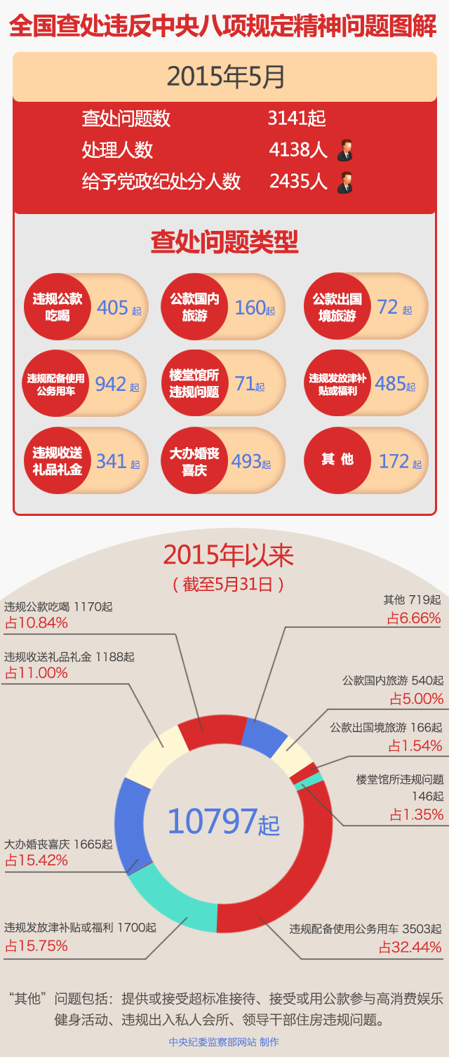 2015年5月全国查处违反中央八项规定精神问题3141起。