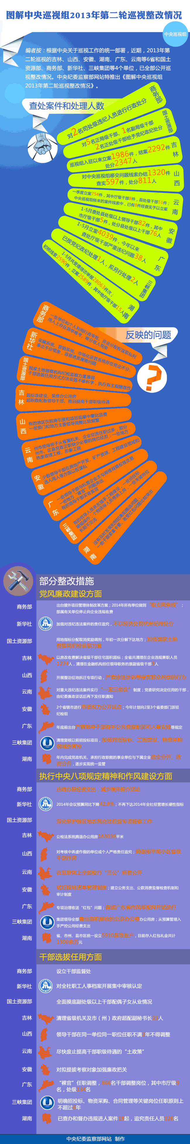 根据中央关于巡视工作的统一部署,近期,2013年第二轮巡视的吉林、山西、安徽、湖南、广东、云南等6省和国土资源部、商务部、新华社、三峡集团等4个单位,已全部公开巡视整改情况。中央纪委监察部网站特推出《图解中央巡视组2013年第二轮巡视整改情况》。