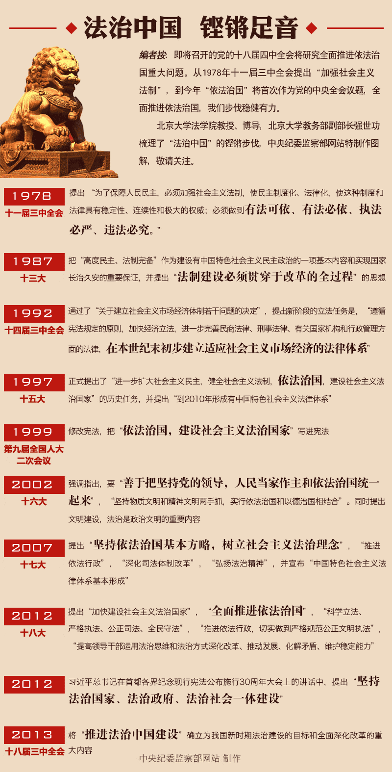 编者按:即将召开的党的十八届四中全会将研究全面推进依法治国重大问题。从1978年十一届三中全会提出“加强社会主义法制”,到今年“依法治国”将首次作为党的中央全会议题,全面推进依法治国,我们步伐稳健有力。 北京大学法学院教授、博导,北京大学教务部副部长强世功梳理了“法治中国”的铿锵步伐,中央纪委监察部网站特制作图解,敬请关注。