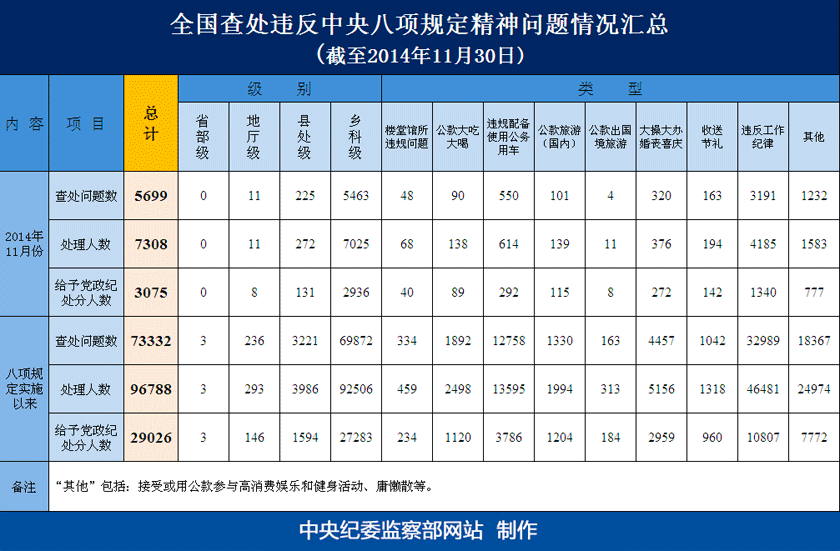 为掌握全国贯彻落实八项规定精神情况,中央纪委在31个省区市和新疆生产建设兵团、59个中央和国家机关建立了落实中央八项规定精神情况月报制度。截至2014年11月30日,全国查处违反中央八项规定精神问题情况如下: