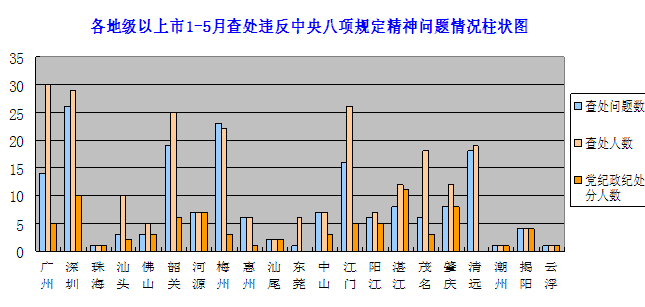 通报显示,今年1至5月,全省各级纪检监察机关共查处违反中央八项规定精神问题186个,处理259人,给予党纪政纪处分85人(地厅级3人、县处级9人、乡科级以下73人),查处问题数量、处理人数和给予党纪政纪处分人数均已接近去年全年数量,查处力度明显加大。省、市纪检监察机关积极畅通投诉举报渠道,加大暗访曝光和案件直查、督办、通报力度,进一步形成了监督执纪工作合力。其中,省纪委直接查办违反中央八项规定精神问题6个,处理9人,党纪政纪处分4人(厅级3人、乡科级1人);交办、督办违反中央八项规定精神信访举报115件;通报或曝光违反中央八项规定精神和损害群众利益典型案例40件,起到了很好的教育警示作用。广州、深圳、韶关、河源、梅州、江门、阳江、湛江、肇庆等地级以上市监督执纪力度较大,查处问题数和党纪政纪处分人数较多,效果较好。但也有个别地区执行纪律失之于宽、失之于软,查处问题和党纪政纪处理人数偏少,工作落实不够到位。