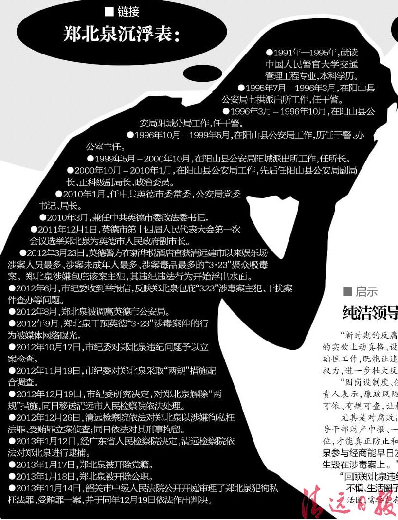 ●2012年3月23日,英德警方在新华悦酒店查获清远建市以来娱乐场涉案人员最多、涉案未成年人最多、涉案毒品最多的“3·23”聚众吸毒案。郑北泉涉嫌包庇该案主犯,其违纪违法行为开始浮出水面。