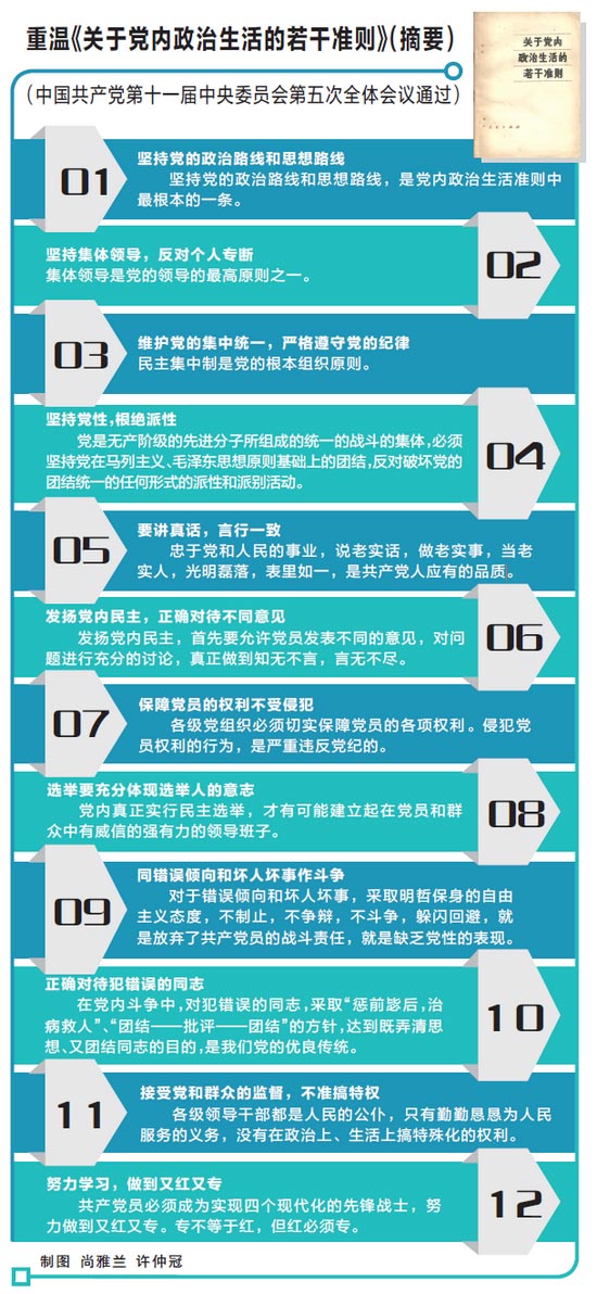 谢春涛:现在很多人有了学党章的意识,但是党内政治生活准则都包括什么并不清楚,更谈不上遵守。结合习近平总书记的讲话,再去重温党内政治生活的若干准则,你会发现这个34年前制定的准则远没有过时,我们需要不断学习领会并遵照执行。不论是党组织,还是党员领导干部,都要遵守准则,运用到党员民主生活会和党员民主评议当中,体现在日常的政治生活当中,让它真正指导自己的行为。要有关于违背准则的责任追究机制,借鉴党的十八大以来抓作风建设的经验,总结群众路线教育实践活动的经验,用严格系统的规定约束党员领导干部。
