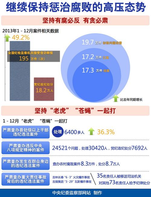 中纪委监察部网站昨日刊发《"老虎""苍蝇"一起打 十八大以来查办案件工作综述》一文,文章指出,2013年,全国纪检监察机关共接受信访举报195.0万件(次),总量比上年增长49.2%;初步核实处置反映问题线索19.7万件,立案17.2万件,结案17.3万件,给予党纪政纪处分18.2万人。被处分人数比上年增加2.1万人,增幅达13%。被处分的县处级以上干部6400多人,比上年同期增长36.3%。