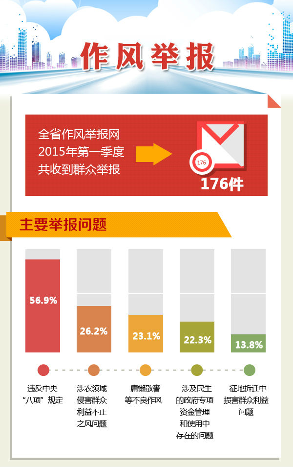 充分整合资源,发挥广东作风举报网、效能投诉网、12388举报热线、行风评议热线等监督举报平台作用,畅通群众举报渠道,延伸监督触角,及时受理群众信访举报,及时反馈办理情况和调查处理结果。干部群众对反腐败斗争的信心日益增强,举报党员干部违反中央八项规定精神问题的积极性提高,今年第一季度全省作风举报信访件比去年同期有所上升,其中,全省作风举报网共收到群众举报176件,反映违反中央八项规定问题的举报件排名第一占56.9%,举报热点集中在违规配备使用公务用车(10%)、公款大吃大喝(8%)、违规收送红包礼金(7%)。