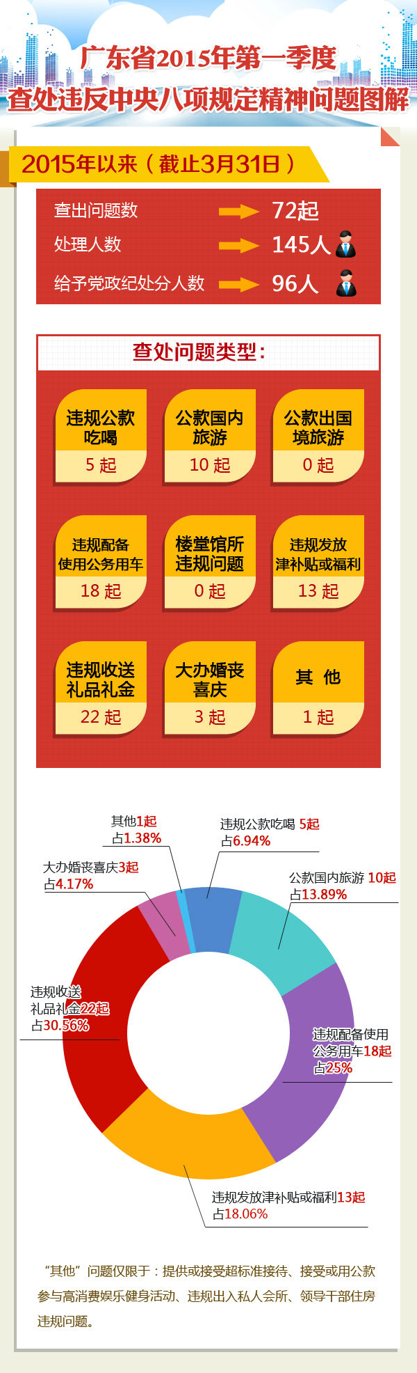 建立举报线索管理台账,加大直查督办力度。近期,省纪委严肃查处了省卫生计生委和台山市卫生计生局个别干部违规收送“红包”等典型案件。第一季度,全省共查处违反中央八项规定精神问题72起,处理145人,给予党纪政纪处分96人。建立省、市、县三级暗访联动机制,加大曝光力度。省纪委第一季度暗访曝光“四风”问题22起,给予党纪政纪处分23人。
