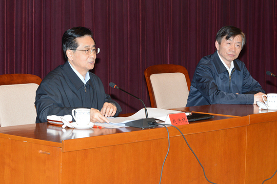 中央书记处书记、中央纪委副书记赵洪祝(左)主持会议并对贯彻落实工作提出要求,中央纪委副书记、监察部部长黄树贤(右)传达会议精神。