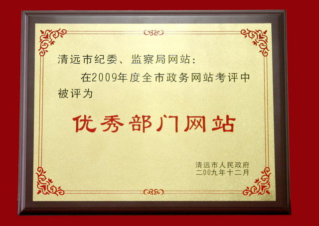 图为清远纪检监察网被评为2009年度全市优秀部门网站奖牌