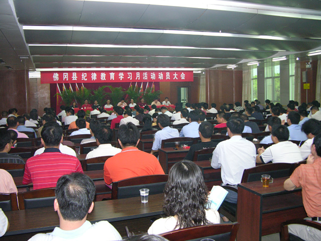 8月7日下午,佛冈县召开纪律教育学习月活动动员大会,要求结合当前开展的深入学习实践科学发展观活动,以“加强作风建设,保障科学发展”为主题,加强对党员干部的党性党风党纪教育,大力推进廉政文化建设。强调要通过教育学习,着力解决党员干部作风方面存在的突出问题,突出抓好机关作风建设,营造崇廉尚洁、风清气正的社会环境,为该县的改革发展稳定提供保障。