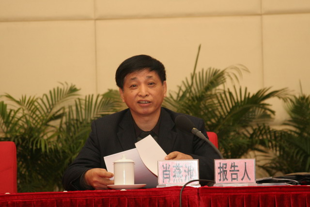 图为省纪委效能监察室主任肖燕池为与会人员作效能监察、行政问责的辅导讲座