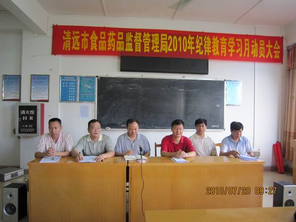 7月20日,清远市食品药品监督管理局召开2010年纪律教育学习月活动动员大会。该局党组书记、局长黎建华同志作教育学习动员讲话,副调研员詹松星部署教育月工作,局机关、市药检所全体党员干部等近70人参加了会议。会议由副局长罗家泉主持