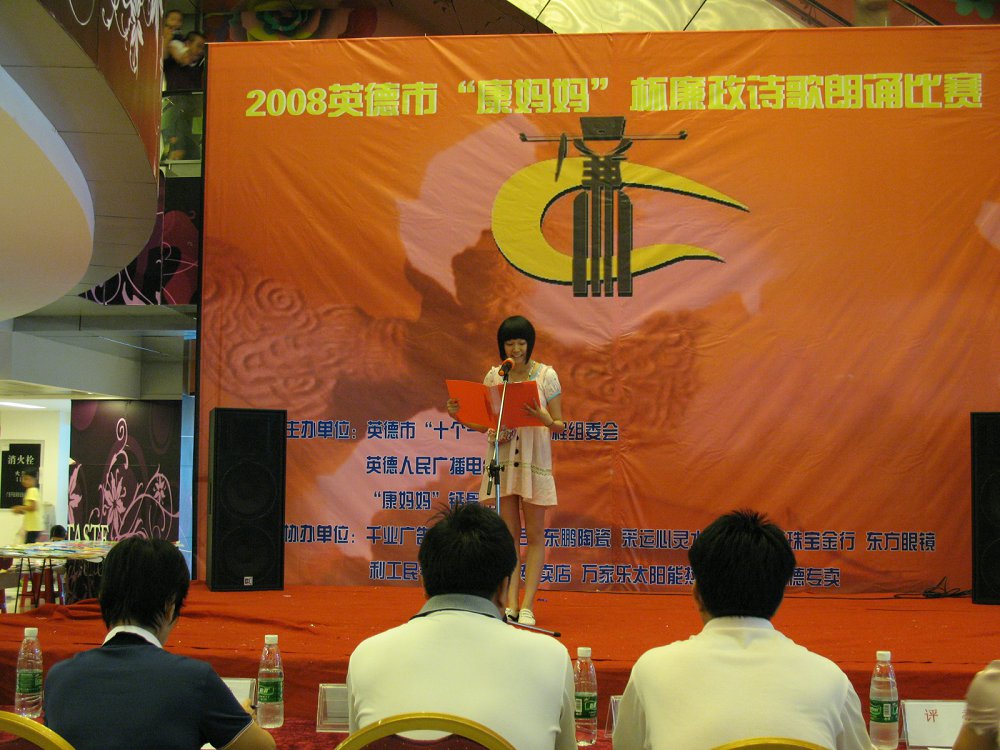 英德市2008“康妈妈”杯廉政诗词朗诵比赛,由英德市“十个一”倡廉工程组委会主办,英德电台、“康妈妈”钙骨馆联合承办,是我市今年以廉政诗词朗诵比赛为链条的廉洁文化教育生态系统工程的重要举措。经过紧张的比赛,成幸雯获得一等奖,邓学夫、周凤、李明欣分别获二等奖,张邦洪、林晔、朱诗俊分别获三等奖,唐晓岚获特别奖,黄福芳、张美灵、快乐1组、快乐2组分别获得鼓励奖。