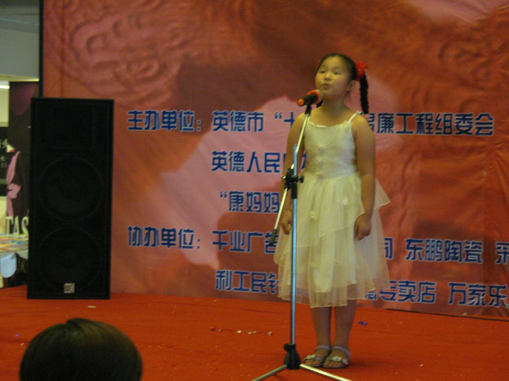 9月6日下午,英德市2008“康妈妈”杯廉政诗词朗诵比赛在太阳城购物广场举行,来自社会各界的60多位诗词爱好者参加了比赛,年纪最大的79岁,最小的6岁。经过激烈的角逐,成幸雯脱颖而出,一举捧走“康妈妈”杯。