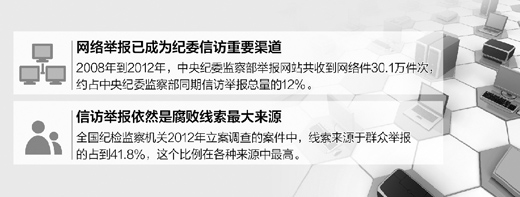 2008年到2012年,中央纪委监察部举报网站共收到网络件30.1万件次,约占中央纪委监察部同期信访举报总量的12%,其中检举控告类网络件21.9万件次,网络举报已经成为继来信、来访、电话之后又一重要举报渠道。