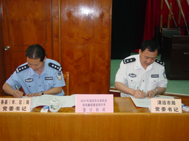 会上,清远市公安局党委委员带头签订了《广东省公安民警廉洁从警承诺书》,市委常委、政法委书记、市局党委书记、局长周细牛同志与9个县(市、区)公安局党委书记签订《清远市公安机关党风廉政建设责任书》,并在会上带领全体与会人员进行廉政承诺宣誓。