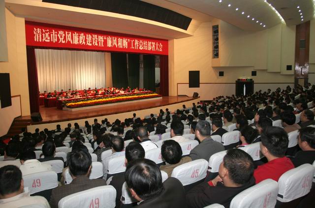 2009年2月9日上午,清远市召开党风廉政建设暨“廉风和畅”工作总结部署大会。会议认真学习贯彻了中央纪委十七届三次和省纪委十届三次全会精神,总结了去年全市反腐倡廉工作,部署了新一年的工作任务,并集中观看了广东省机关作风建设暗访专题片。