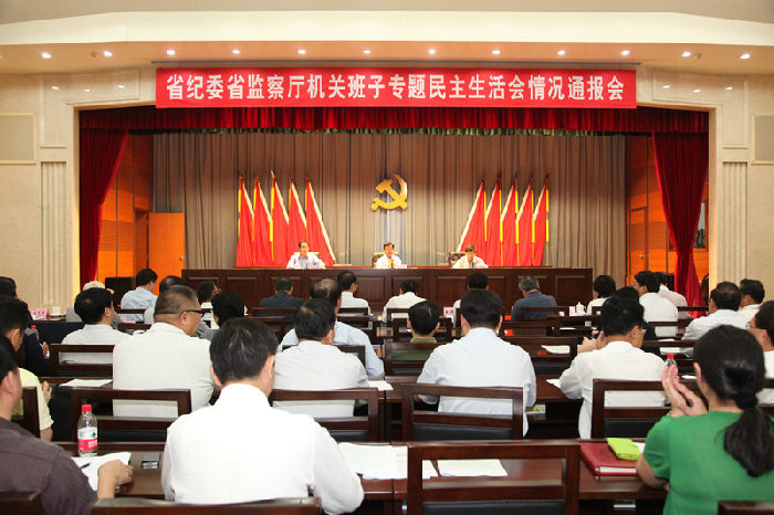 省委常委、省纪委书记黄先耀同志在会上通报了10月19日省纪委省监察厅召开领导班子专题民主生活会情况。指出,根据中央和省委的部署要求,严格按照“照镜子、正衣冠、洗洗澡、治治病”的总要求,委厅领导班子成员联系思想、作风、工作实际和成长经历,聚焦“四风”,以整风精神开展批评和自我批评,针对查摆出来的问题,从理想信念、宗旨意识、党性修养和政绩观、权力观、世界观等方面认清问题实质,深挖思想根源,找准症结所在。在全面查摆问题和深刻剖析原因的基础上,提出了有针对性的整改措施,并着眼于纪检监察工作全局,提出了进一步改进作风的意见建议。专题民主生活会收到了红脸出汗、动真碰硬、触及思想和灵魂的良好效果,达到了统一思想、增进团结、促进工作的目的,取得了预期效果。