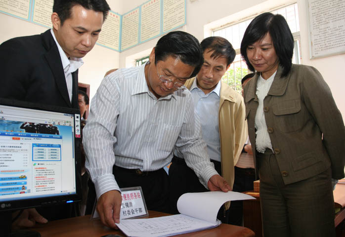 图为省、市纪委领导在检查村务公开工作情况。