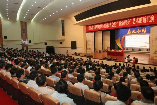 2009年7月6日下午,清远市委举办“纪律教育学习月活动集中活动日”活动,包括该市四套班子领导,各县(市、区)党政主要领导、纪委书记,市直单位主要领导在内的800多名党员领导干部,通过观看大中小学生“廉洁修身”艺术朗诵表演,听取纪律教育学习月动员讲话和反腐倡廉专题辅导,受到了一次内容丰富,既活泼又严肃、既生动又深刻的廉洁文化熏陶和廉洁从政教育,并以此正式拉开了今年纪律教育月活动的序幕。省纪委副书记赵振华,省纪委常委许泽红,省纪委案管室主任赵康,省纪委宣教室主任凌曲刚,省教育厅纪工委书记陈寒晓等专程前来出席了活动。