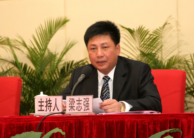 图为清远市委常委、常务副市长梁志强主持会议并作《清远市