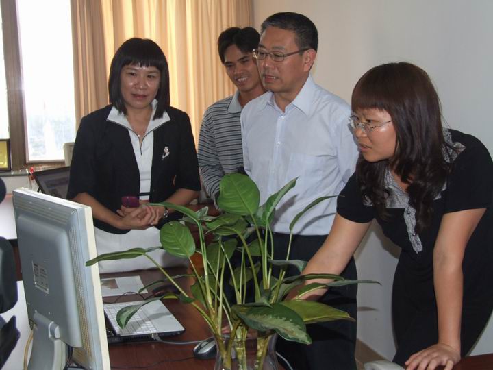 图为清远市委书记葛长伟(右二)在市委常委、纪委书记黄兆芬(左一)陪同下视察清远纪检监察网站