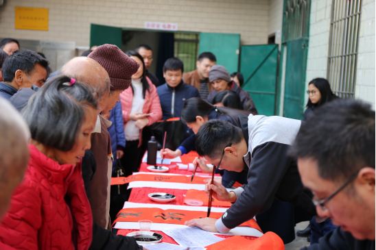 活动现场气氛热烈,一边是清新区纪委监委干部现场挥毫泼墨,书写富含廉洁元素、时代精神的福字春联,另一边是群众井然有序地挑选自己心仪的春联,兴高采烈地牵绳、拉纸等待春联的墨汁晾干。