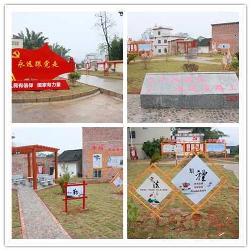 大塘村勤廉公园选址村委会、村勤廉监督室门前,是占地550平方米的开放式公园。在通往公园的路口,一面鲜红党旗造型的雕塑映入眼帘,“永远跟党走”及“人民有信仰、国家有力量”两行字呼唤党性、振奋人心。道路两旁,共有14块古典中国风宣传牌,一半简练展示“精读十九大报告”核心要义,另一半摘录宣传习近平总书记的重要论述,号召农村党员干部认真落实新时代党的建设总要求,努力把基层党组织锻造得更加坚强有力。再往里走,公园旁边的操场边缘,有一排齐整的宣传牌,展示从中共一大到十八大的召开情况、重要内容和历史意义,引导党员干部从重温党历次代表大会情况的角度,回顾波澜壮阔而又艰难曲折的党史,自觉培塑信仰的力量,厚植自信的力量,汲取前进的力量。