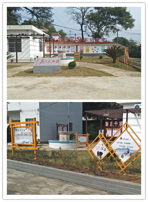 公园周边设置了两大块宣传栏,一块是“不忘初心、牢记使命”主题宣传栏,一边解读勤廉工程及勤廉监督室主要职责和职权、村务监督委员会主要职责和职权,另一边宣传廉洁文化及共产党人在新时代的新征程和新目标。另一块是 “幸福都是奋斗出来的”主题宣传栏,展示“新时代‘担当有为官’”的丰富内涵,列举“政治腐败官”“党员干部不敢担当表现”的现实表现,引导党员干部把总书记提出的“好干部标准”作为实践准则和奋斗方向,不可做不敢担当的干部及“政治腐败官”。