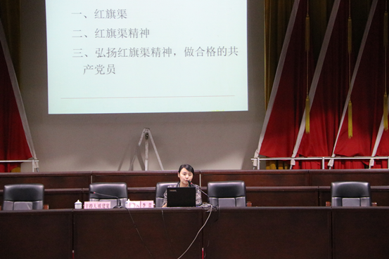 李蕾老师以《弘扬红旗渠精神 做合格党员》为题,围绕“为什么修渠、靠什么修渠”主线,结合“两学一做”学习教育,讲述了红旗渠修建的历史背景,“红旗渠人”在十年如一日的艰苦奋斗中涌现出的一个个感人的故事,逐渐形成了“自力更生、艰苦创业、团结协作、无私奉献”的“红旗渠精神”。李蕾老师的精彩演讲为在座的党员干部呈现了一部共产党领导人民群众“战胜困难、创造奇迹”的奋斗史和精神丰碑,让人震惊、令人鼓舞、催人奋进。