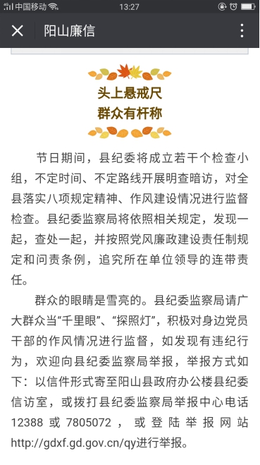 (图为县纪委在“阳山廉信”微信公众号邀请群众监督、公布举报渠道)