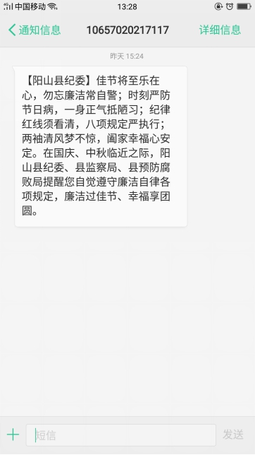 “佳节将至乐在心,勿忘廉洁常自警;时刻严防节日病,一身正气抵陋习;纪律红线须看清,八项规定严执行;两袖清风梦不惊,阖家幸福心安定……”9月25日,全县600多名副科以上干部手机均收到县纪委监察局发来的廉政提醒短信。接下来几天,他们还将陆续收到两条内容各异的提醒短信。据了解,重要节假日前开启短信“定时提醒”模式已是该县坚持多年的惯用做法。