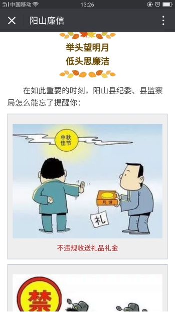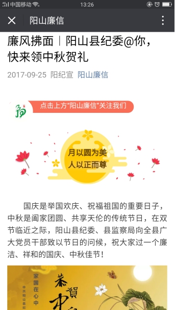 (图为县纪委在“阳山廉信”微信公众号推送的中秋贺卡截图)