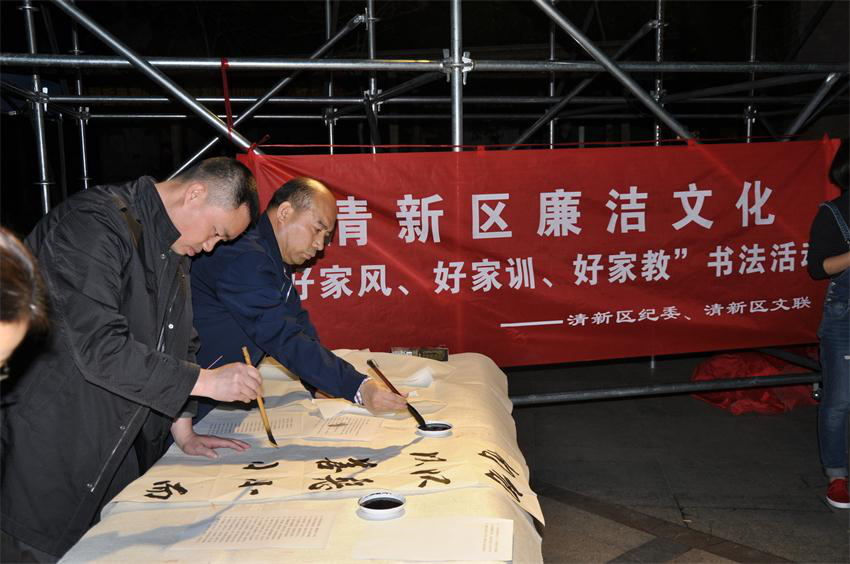 4月13日晚上7点,清新区纪委、区文联组织本区近20多名书画家协会的会员们来到清新太和公园,义务开展传承“好家风、好家训、好家教”送廉洁书法活动。