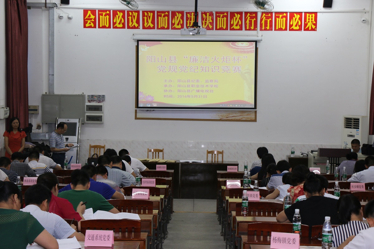 为进一步丰富纪律教育学习月活动内容,引导全县党员干部深入学习党章党规党纪,增强党章意识、党规意识、纪律意识,营造守纪律讲规矩的良好氛围。5月31日,阳山县在县职业技术学校举办“廉洁火炬杯”党规党纪知识竞赛。