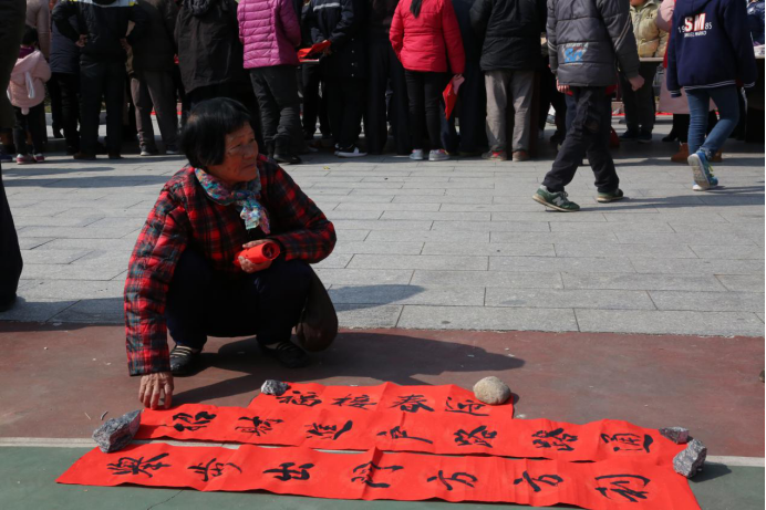 一位老奶奶在守护着写就的心爱春联,墨迹一干,就要拿回家贴家门口。