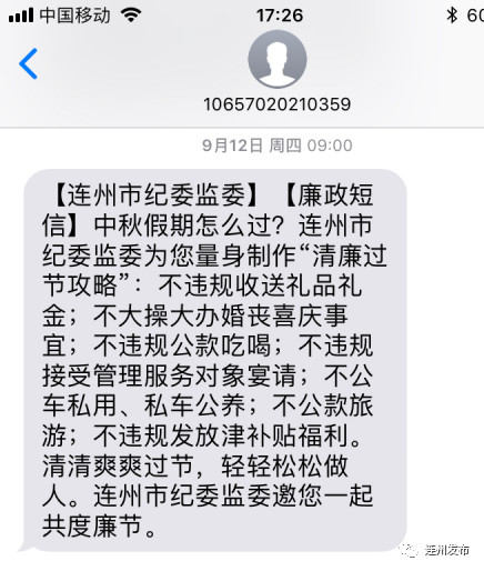 “中秋、国庆假期怎么过?连州市纪委监委为您量身制作‘清廉过节攻略’……”“双节”期间,连州市各级党员干部和公职人员收到了由该市纪委监委发出的廉政提醒短信。