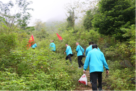 登山人员跟随着党旗和县纪检监察党支部旗帜向秦汉古道进发。