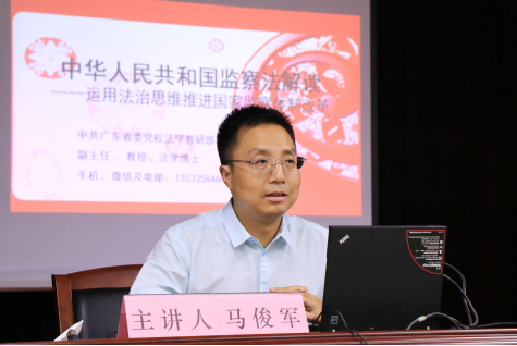 马俊军以“运用法治思维推进国家监察体制改革——《国家监察法》解读”为题,围绕宪法修正案和监察法颁布实施的重大意义,国家监察体制改革的主要内容以及理论总结三大方面,结合一些经典案例,对国家监察法进行了全方位、多角度、立体式的解读。